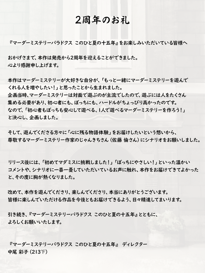 『マーダーミステリーパラドクス このひと夏の十五年』がリリースより2周年を迎えたことを記念して